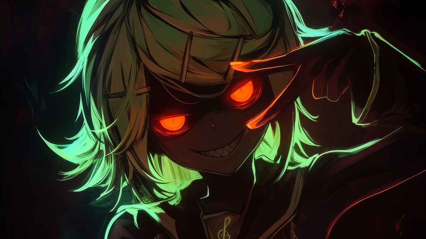 1366x768 аниме, девушка, улыбка, темное, контраст, зеленый, рыжий обои планшет, ноутбук