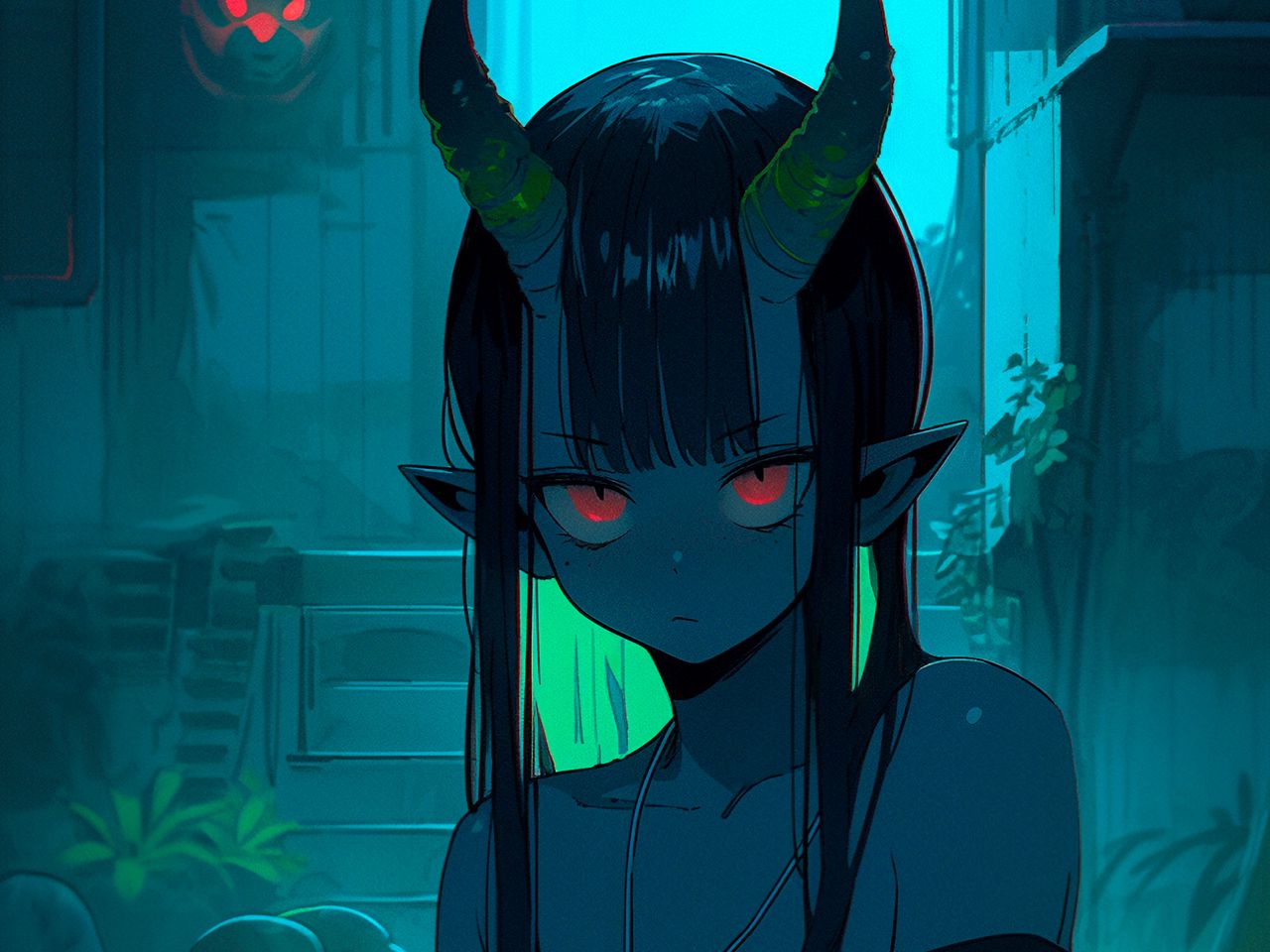 1280x960 аниме, девушка-демон, рога, темнота, светящиеся глаза обои стандарт 4:3