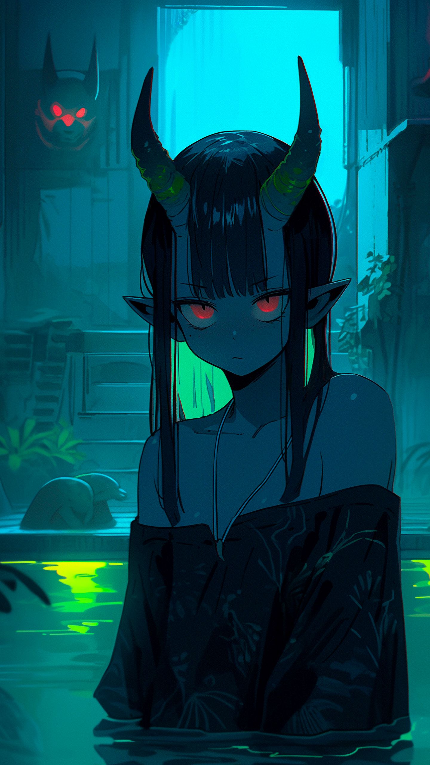 1440x2560 аниме, девушка-демон, рога, темнота, светящиеся глаза обои qhd samsung galaxy s6, s7, edge, note, lg g4