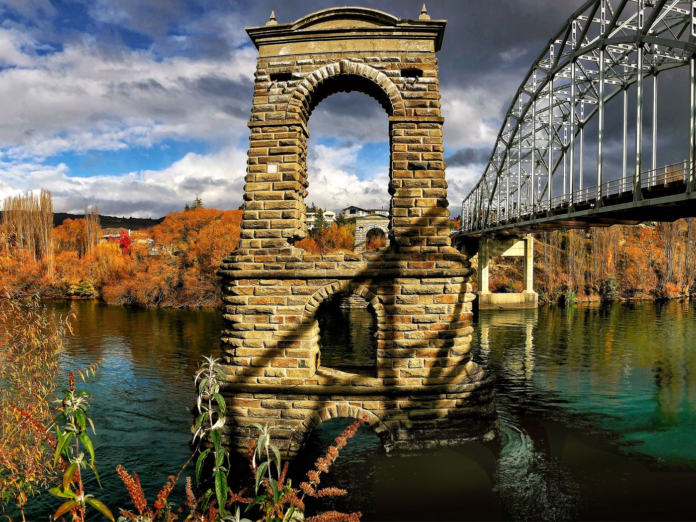 1400x1050 арка, кирпичи, река обои стандарт 4:3