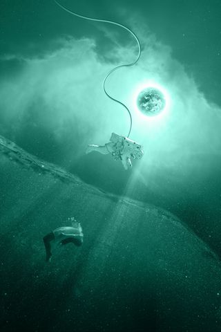 320x480 астронавт, скафандр, девушка, море, фанатазия, вселенная обои samsung galaxy ace gt-s5830, sony xperia e, miro, htc wildfire s, c, lg optimus