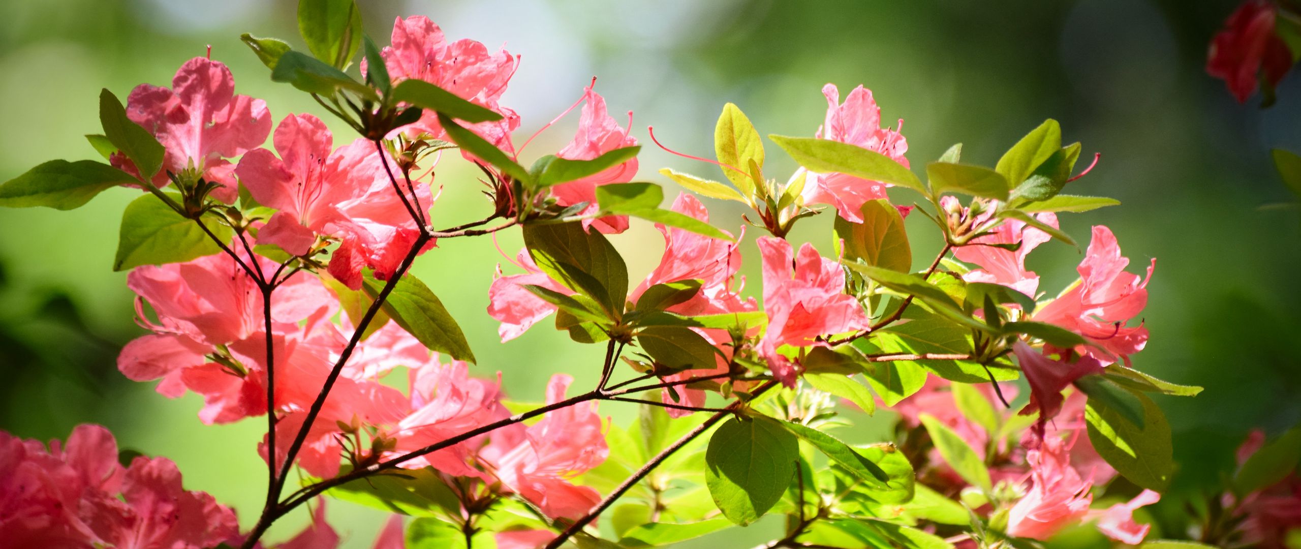 2560x1080 азалия, цветы, ветки, листья обои два монитора 1080p