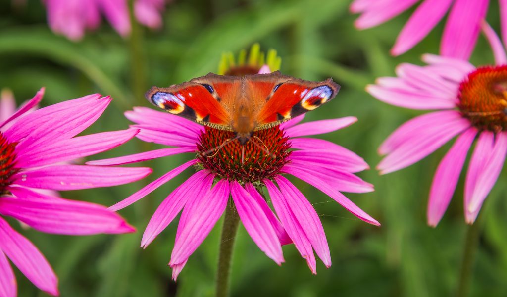 1024x600 бабочка, эхинацея, цветы, лепестки, макро обои нетбук, планшет