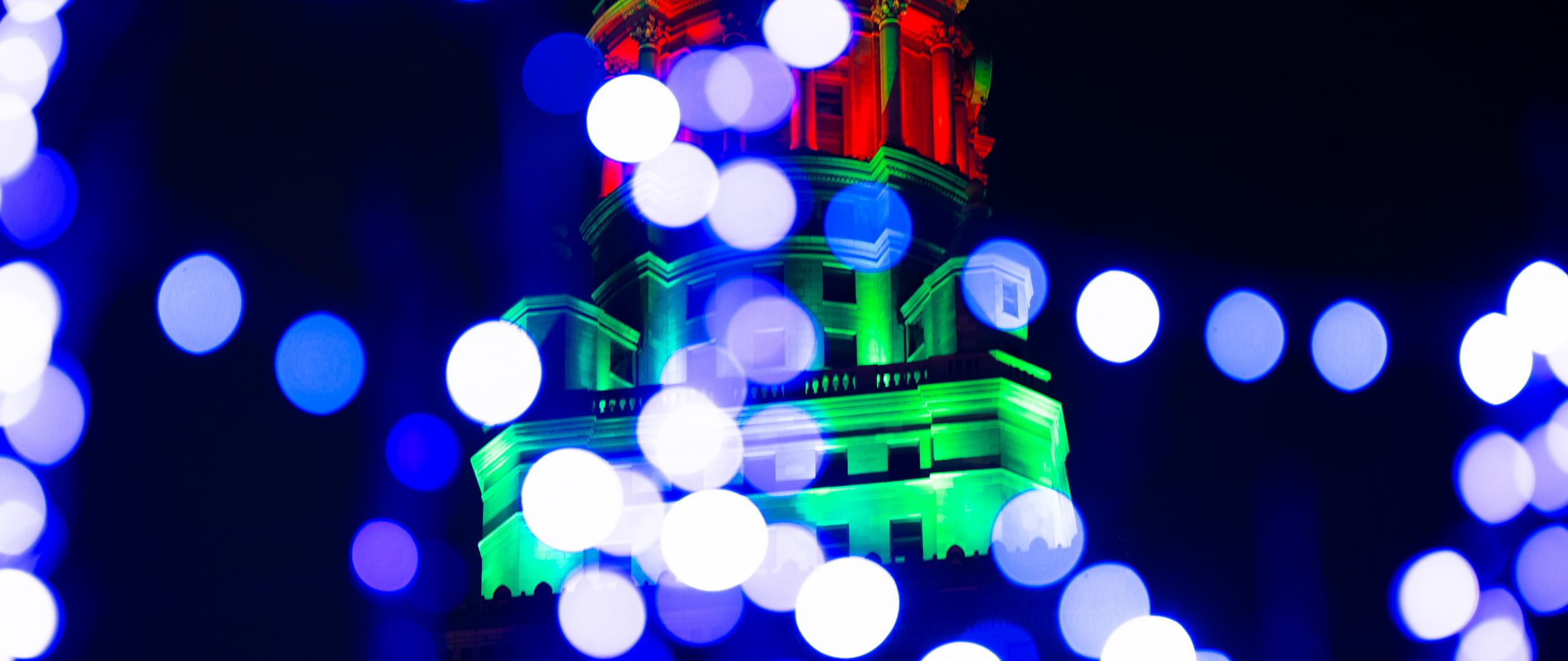 2560x1080 башня, здание, огни, иллюминация, блюр, новый год, праздник обои два монитора 1080p