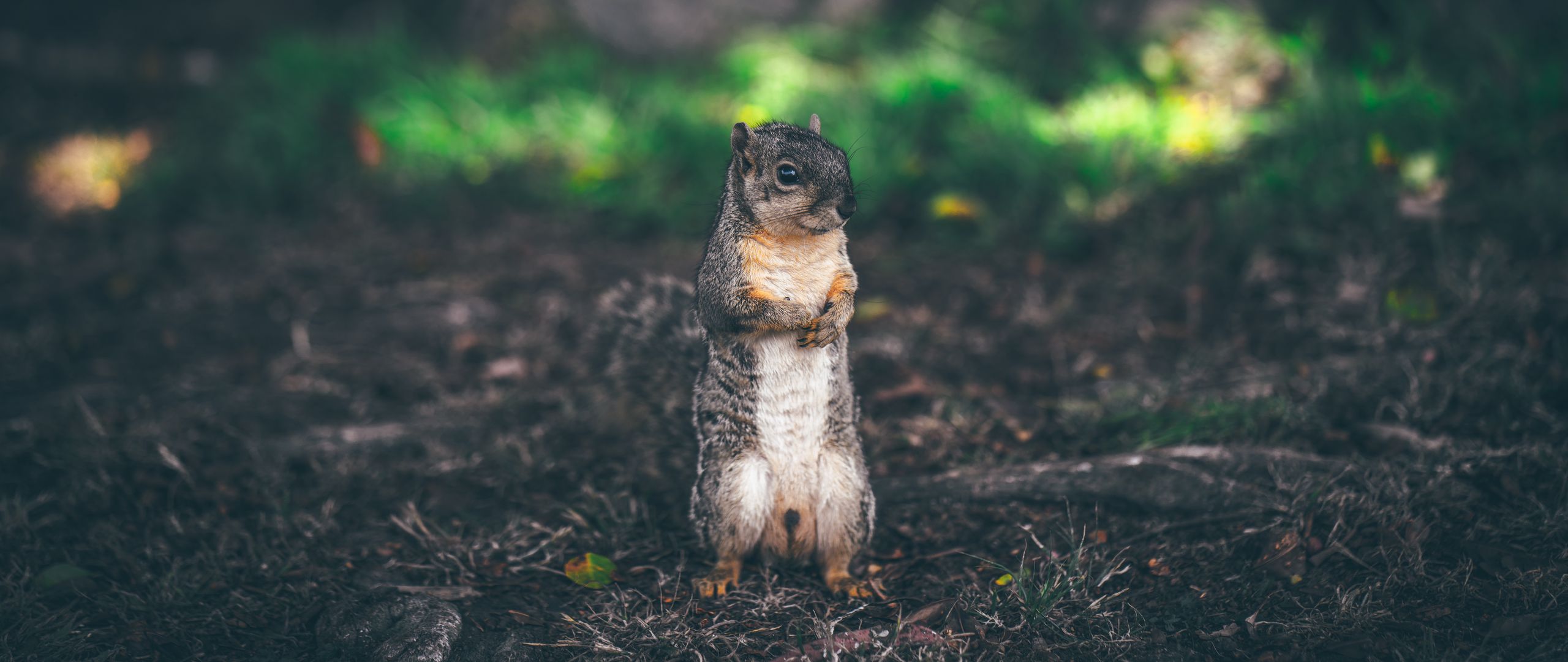 2560x1080 белка, стоит, трава, зверек, размытость обои два монитора 1080p