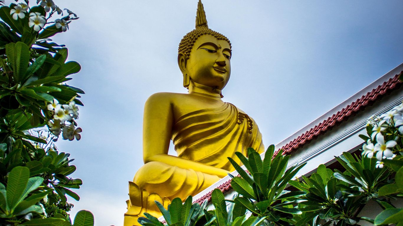 1366x768 будда, буддизм, скульптура, статуя, растения обои планшет, ноутбук