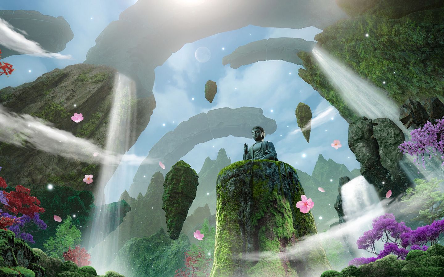 1440x900 будда, статуя, бог, скалы, водопады обои 16:10