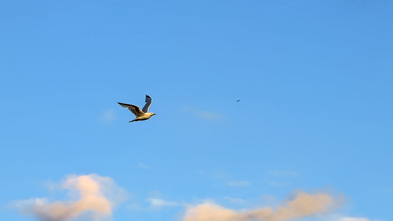 1366x768 чайка, птица, полет, небо, облака, синий обои планшет, ноутбук