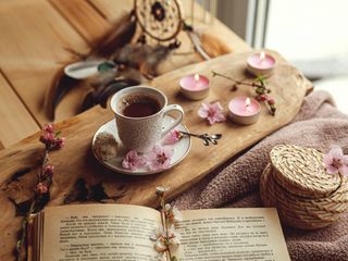 320x240 чашка, книга, цветы, какао, напиток, свечи обои nokia e72, e71, asha, alcatel onetouch