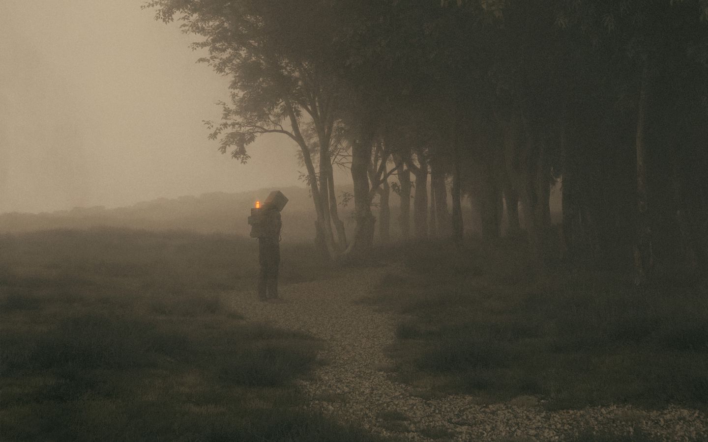 1440x900 человек, куб, деревья, аллея, туман, арт обои 16:10