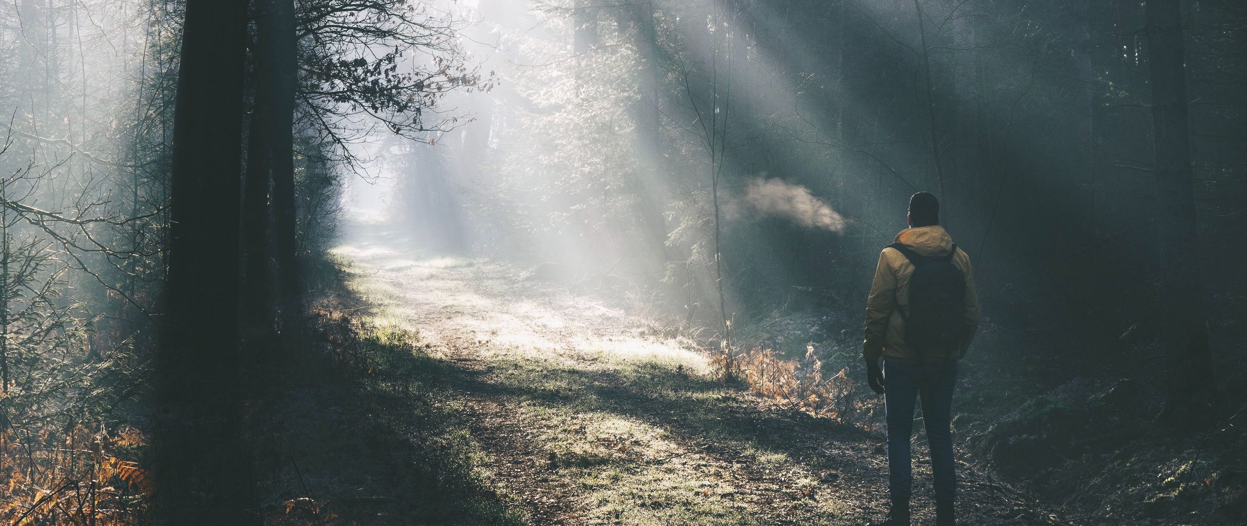 2560x1080 человек, лес, солнечный, свет, туман, природа обои два монитора 1080p