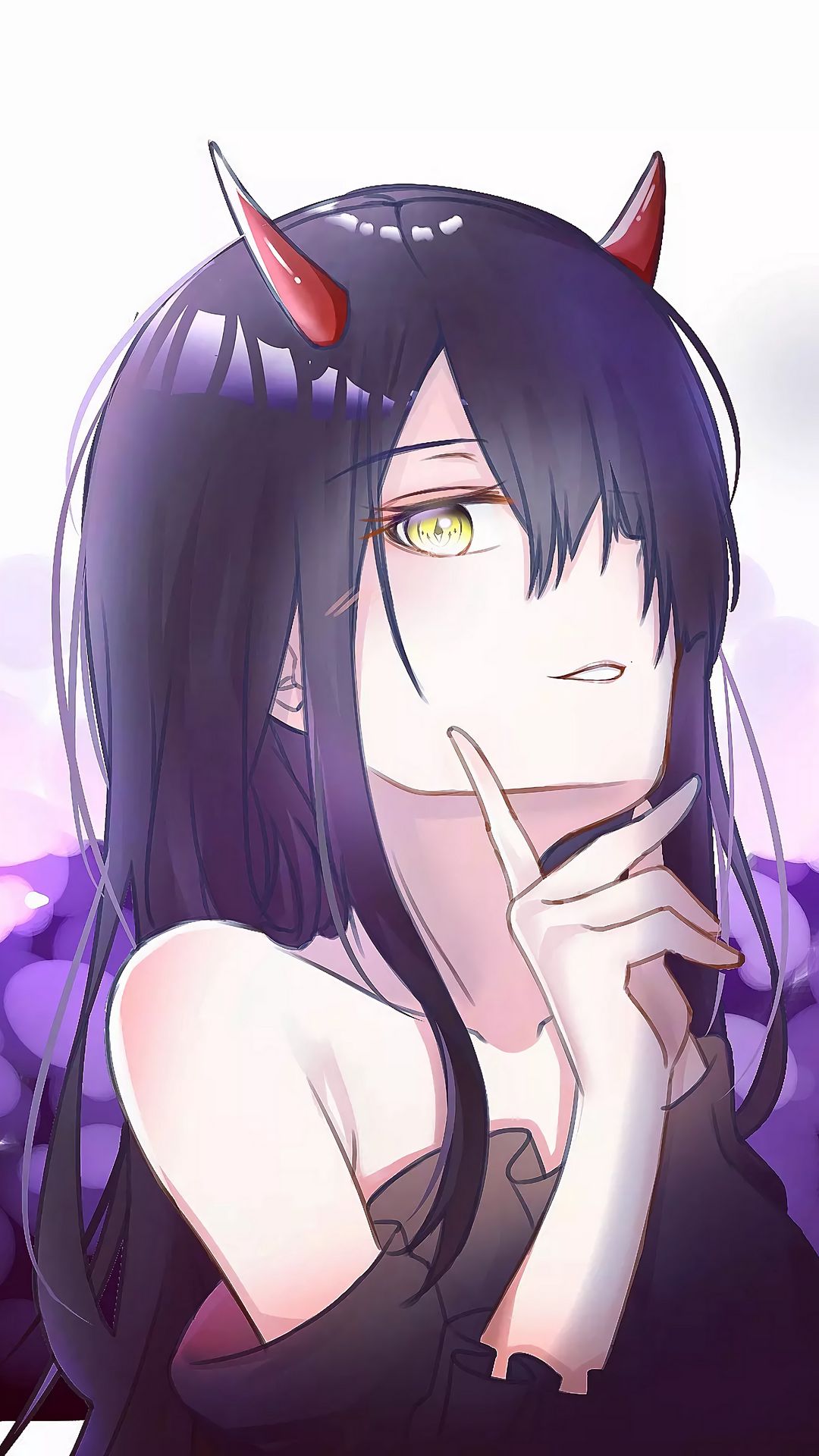 1080x1920 демон, девушка, рога, взгляд, аниме, арт, фиолетовый обои samsung galaxy s4, s5, note, sony xperia z, z1, z2, z3, htc one, lenovo vibe