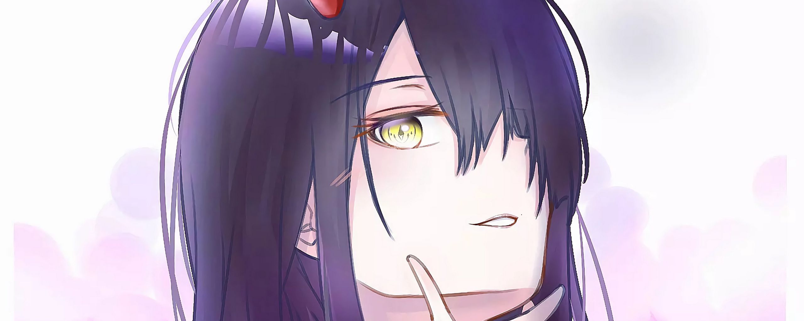 2560x1024 демон, девушка, рога, взгляд, аниме, арт, фиолетовый обои ультраширокий монитор