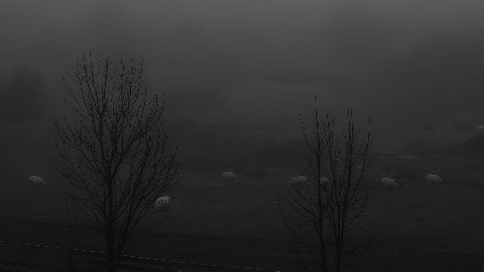 1600x900 деревья, луг, туман, осень, чб обои 16:9