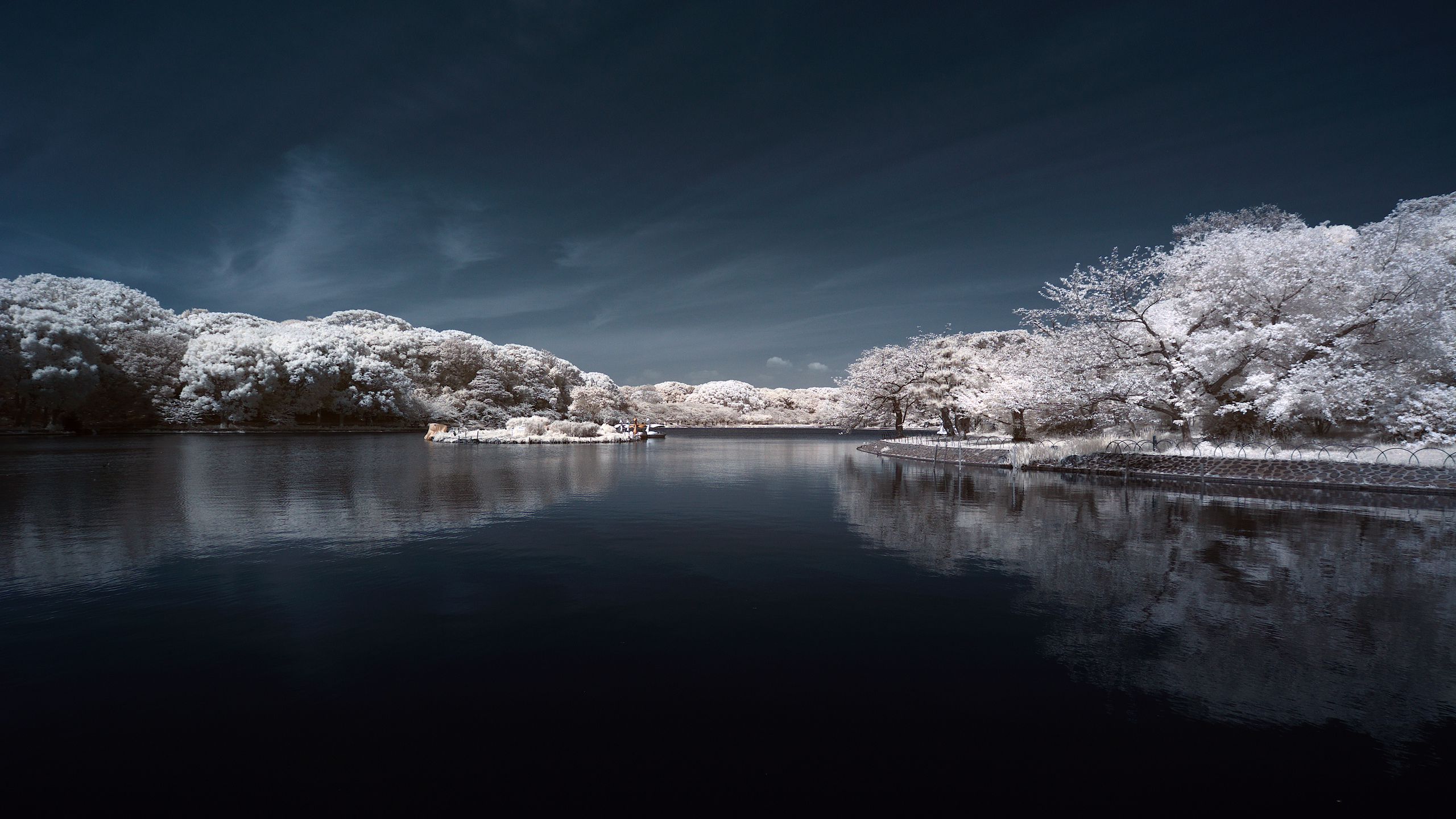2560x1440 деревья в снегу, вода, небо, пейзаж, природа обои 16:9