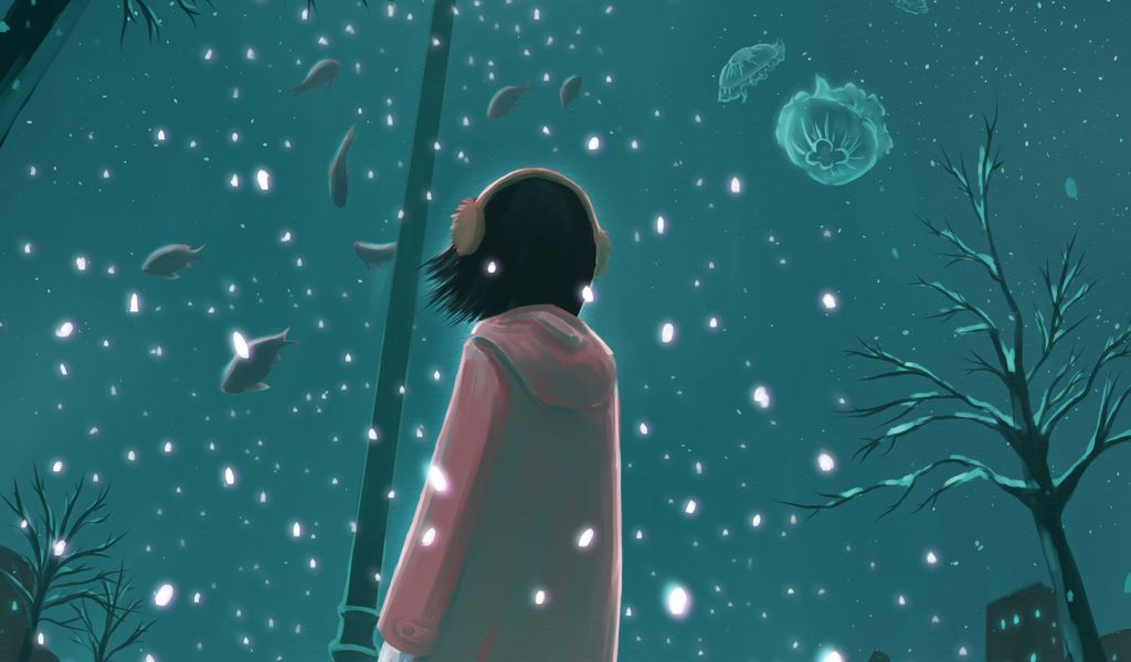1024x600 девочка, фонарь, зима, подводный мир, фантастика, аниме обои нетбук, планшет