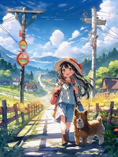 240x320 девочка, улыбка, собака, шляпа, облака, тропа, аниме обои мобильный телефон, смартфон