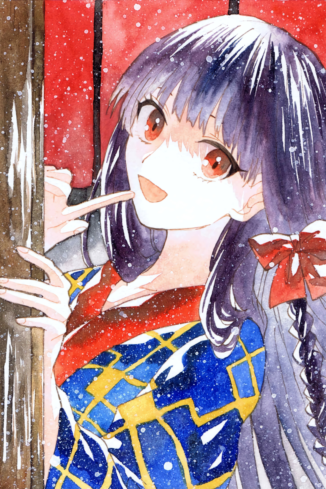 1336x2000 девушка, бант, снег, акварель, аниме обои
