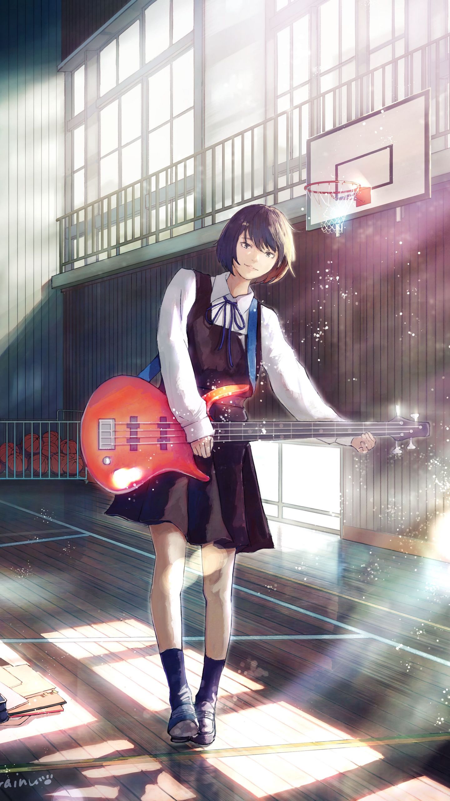 1440x2560 девушка, бас гитара, гитара, улыбка, аниме обои qhd samsung galaxy s6, s7, edge, note, lg g4