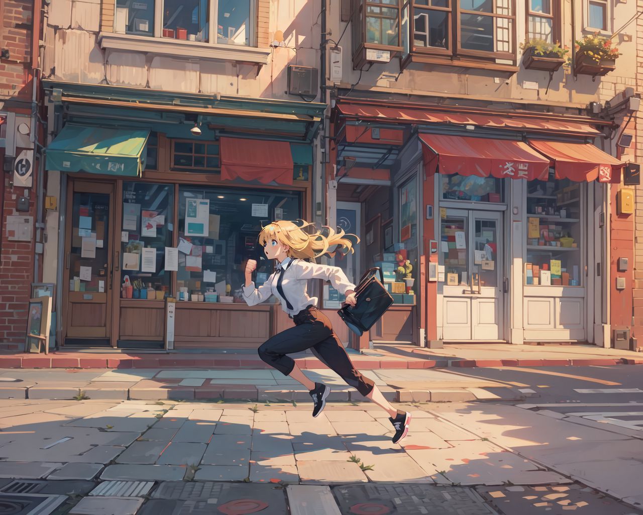 1280x1024 девушка, бег, улица, сумка, аниме, арт обои стандарт 5:4