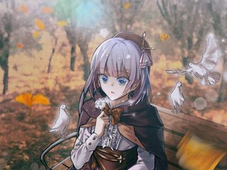 320x240 девушка, берет, голуби, осень, аниме, арт обои nokia e72, e71, asha, alcatel onetouch