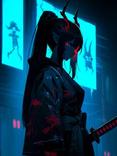 240x320 девушка, демон, рога, кимоно, темный, арт обои мобильный телефон, смартфон