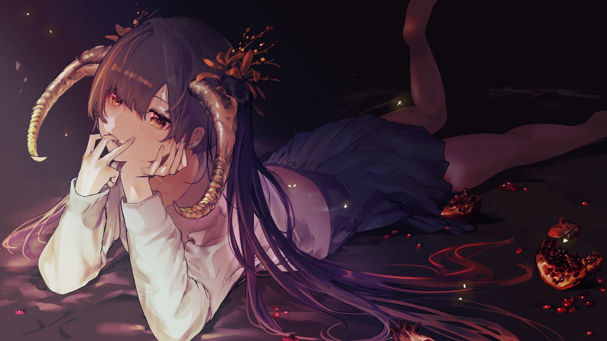 2048x1152 девушка, демон, рога, гранаты, аниме, арт обои ультраширокий монитор