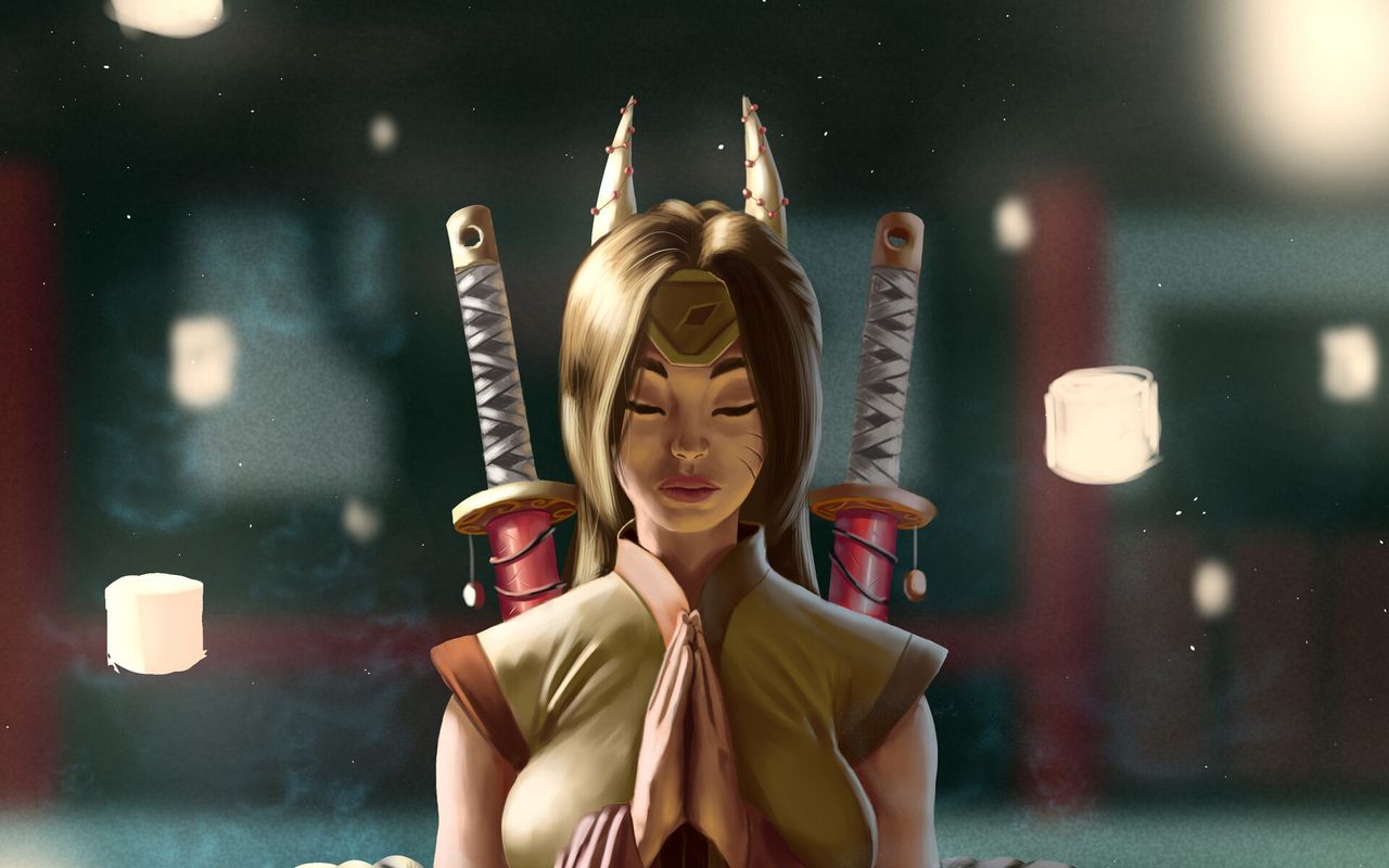 1280x800 девушка, демон, рога, мечи, арт обои 16:10