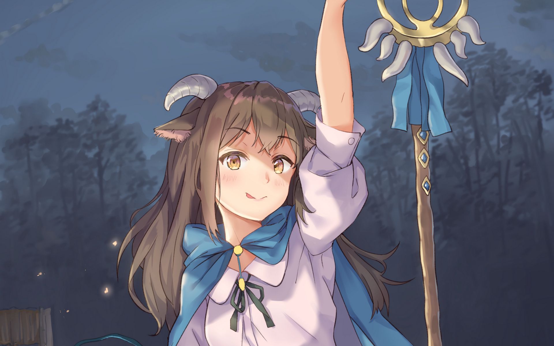 1920x1200 девушка, демон, рога, посох, аниме, арт обои 16:10