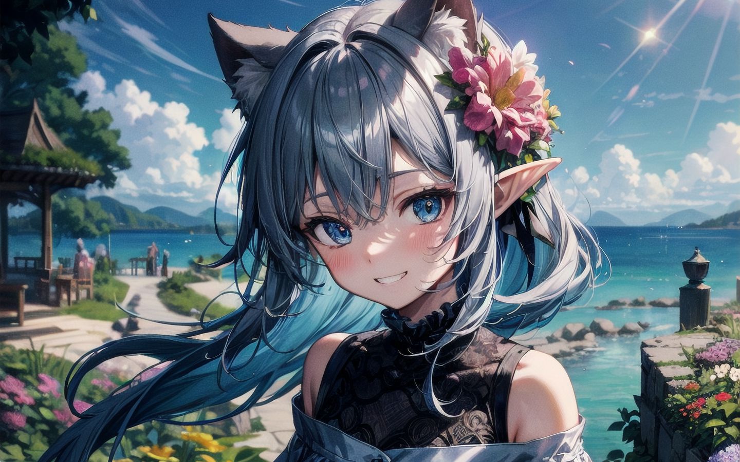 1440x900 девушка, эльф, неко, улыбка, море, аниме, арт обои 16:10