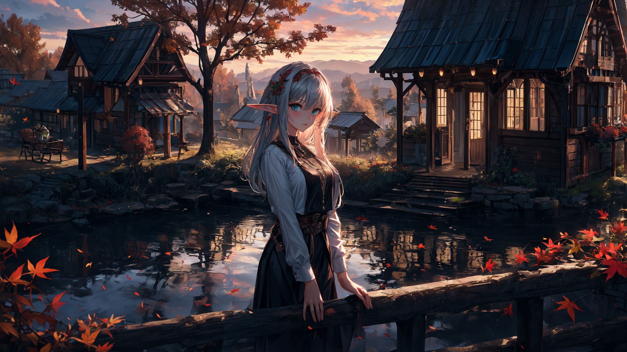 2048x1152 девушка, эльф, пруд, аниме, арт обои ультраширокий монитор