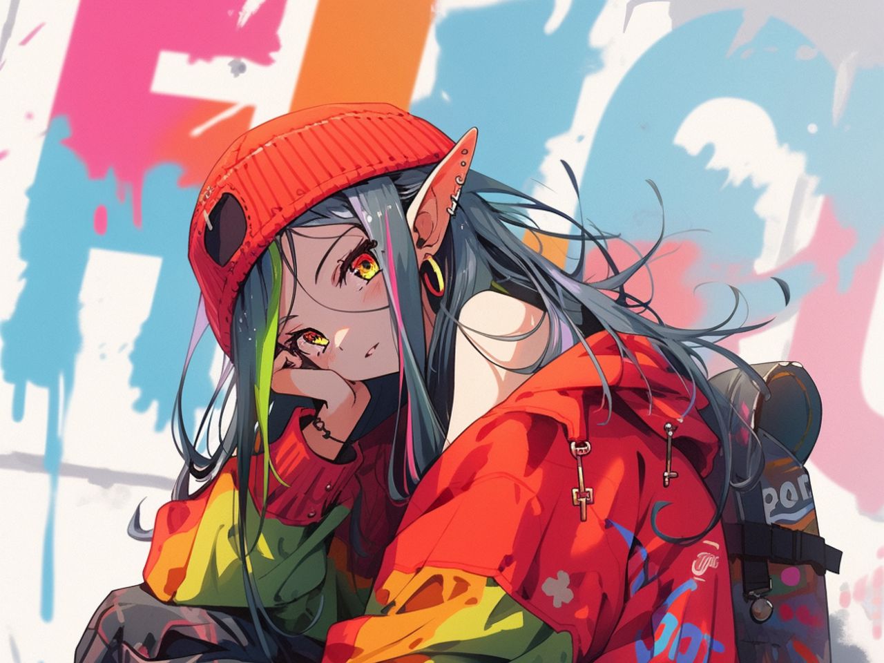 1280x960 девушка, эльф, серьги, шапка, куртка, кеды, аниме обои стандарт 4:3