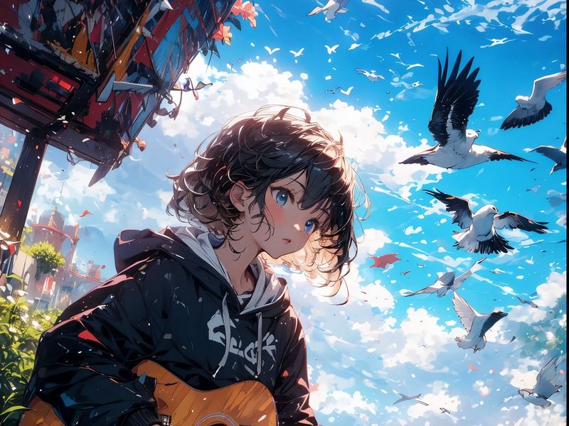 800x600 девушка, гитара, чайки, арт, аниме обои pocket pc, pda, кпк
