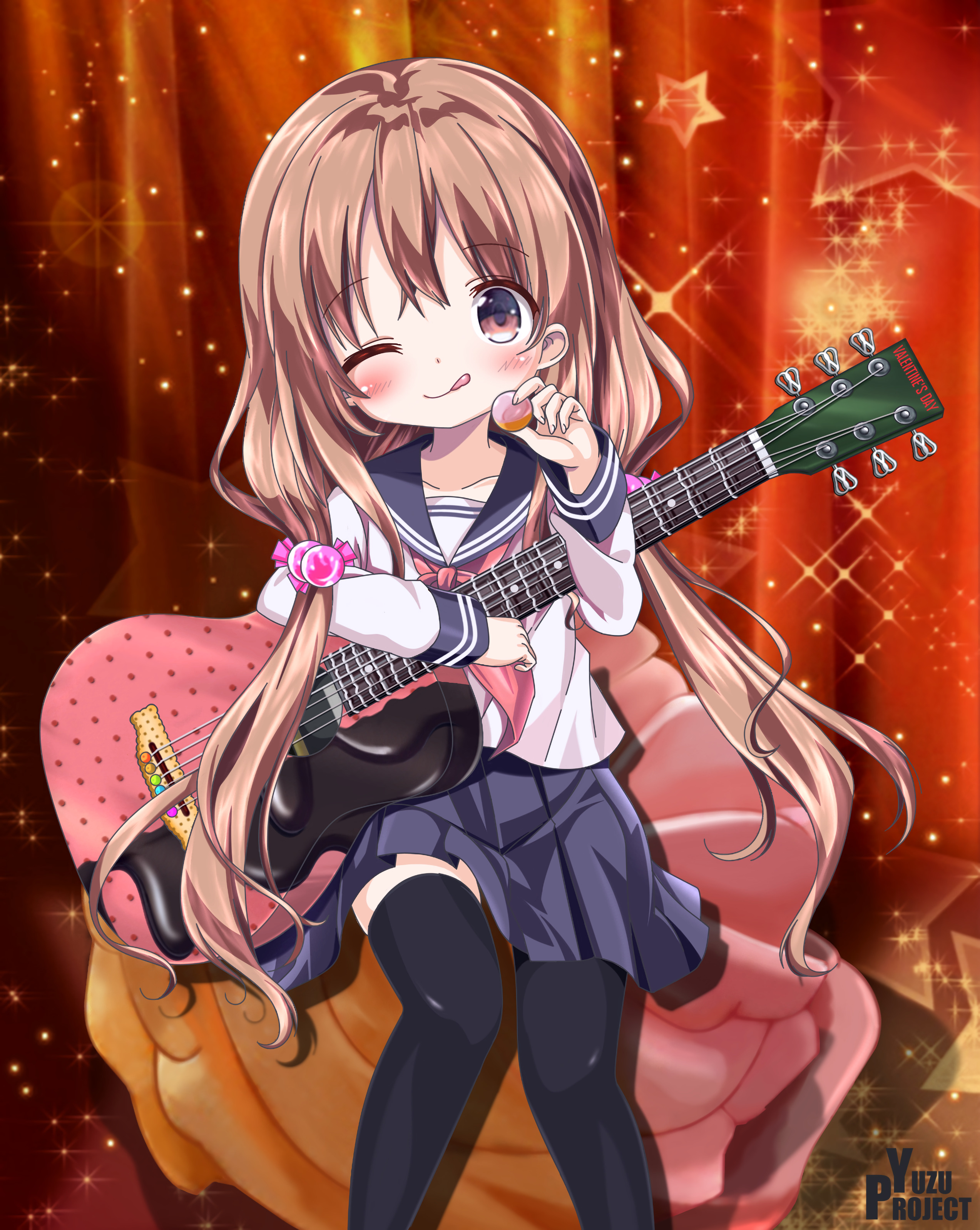 2546x3196 девушка, гитара, конфета, улыбка, аниме, арт обои