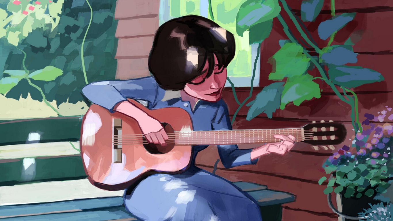 1366x768 девушка, гитара, музыка, кошка, арт обои планшет, ноутбук