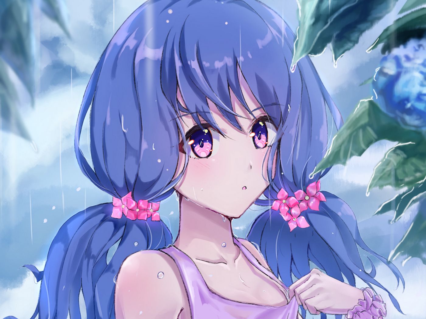 1400x1050 девушка, хвостики, дождь, капли, аниме обои стандарт 4:3
