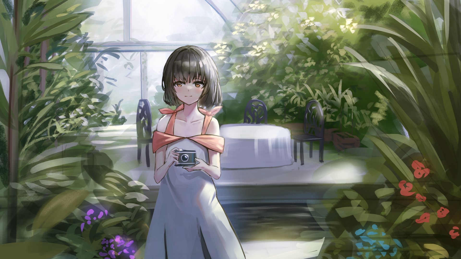1920x1080 девушка, камера, сад, оранжерея, аниме, арт обои full hd, hdtv, fhd, 1080p