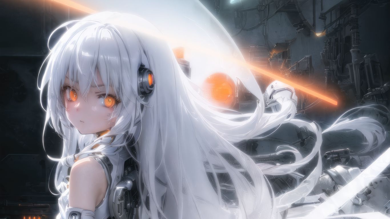 1366x768 девушка, киборг, волосы, глаза, наушники, светлый, аниме обои планшет, ноутбук