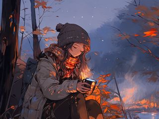 320x240 девушка, кофе, костер, осень, арт, аниме обои nokia e72, e71, asha, alcatel onetouch
