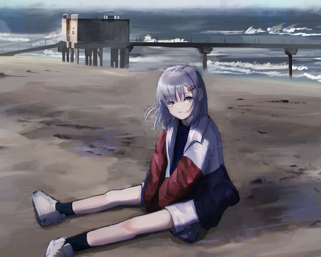 1280x1024 девушка, куртка, пляж, аниме, арт обои стандарт 5:4