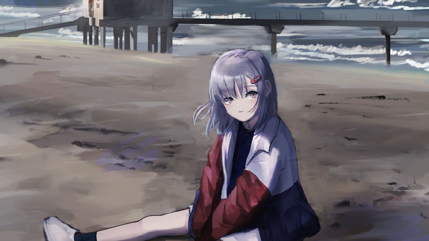 1366x768 девушка, куртка, пляж, аниме, арт обои планшет, ноутбук