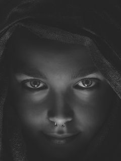 240x320 девушка, лицо, пирсинг, чб, капюшон обои мобильный телефон, смартфон