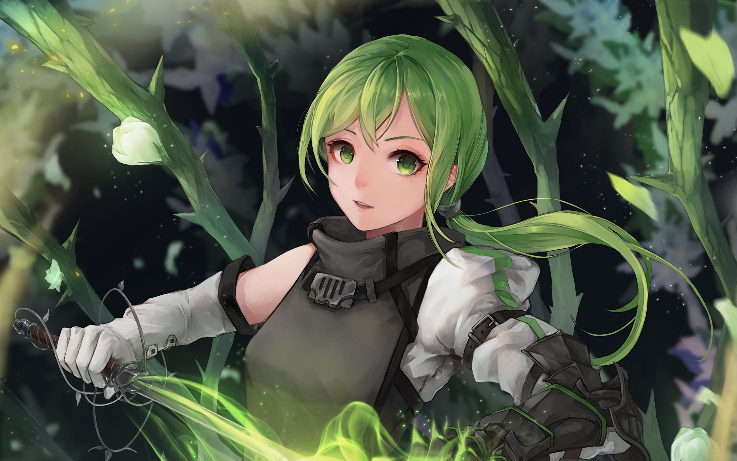 2560x1600 девушка, нимфа, меч, аниме, арт, зеленый обои 16:10