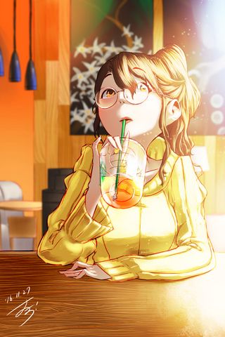 320x480 девушка, очки, напиток, стакан, кафе, аниме обои samsung galaxy ace gt-s5830, sony xperia e, miro, htc wildfire s, c, lg optimus