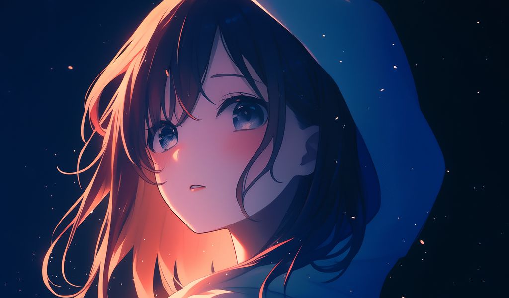 1024x600 девушка, плащ, капюшон, звезды, аниме, арт обои нетбук, планшет