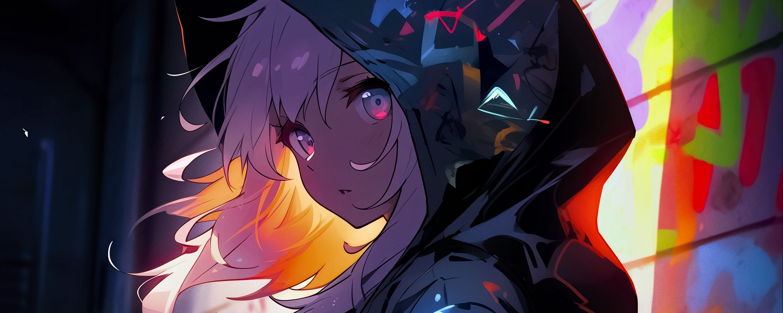 2560x1024 девушка, плащ, капюшон, граффити, арт, аниме обои ультраширокий монитор