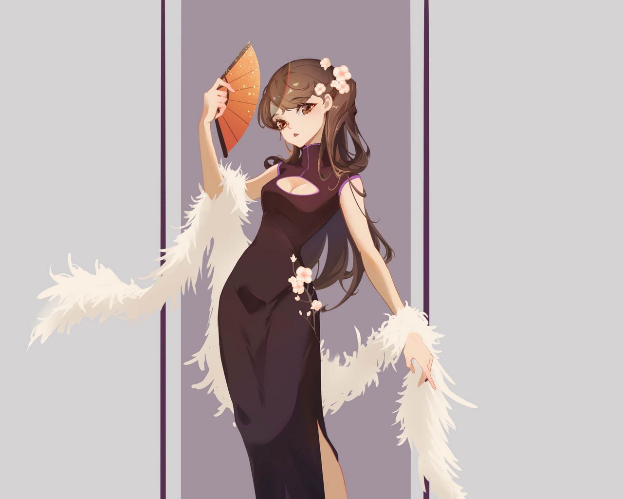 1280x1024 девушка, платье, веер, аниме, арт обои стандарт 5:4