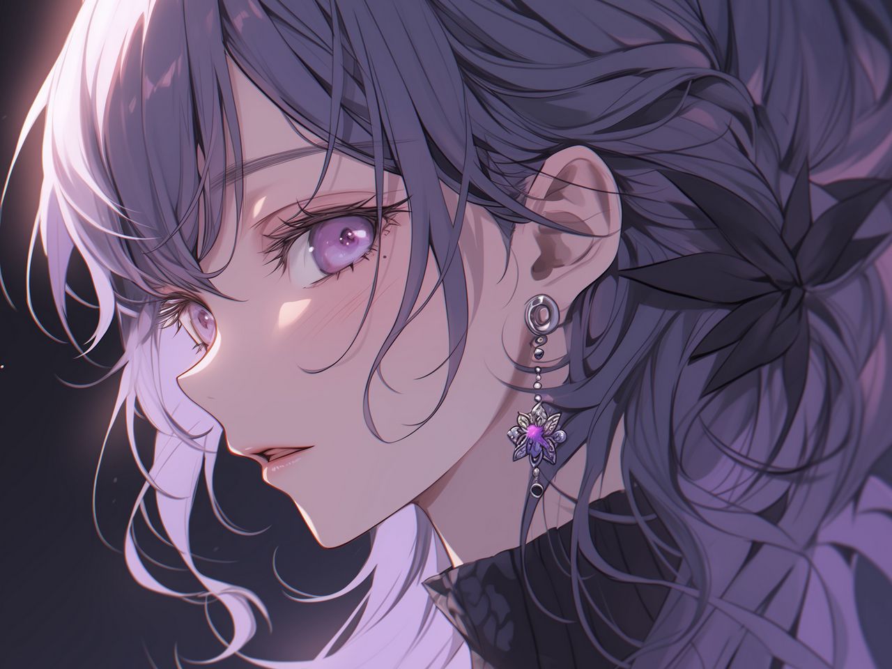 1280x960 девушка, профиль, лицо, сережка, аниме, фиолетовый, арт обои стандарт 4:3