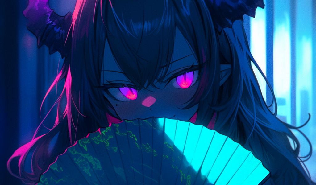 1024x600 девушка, румянец, веер, рога, неон, арт, аниме обои нетбук, планшет