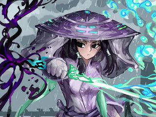 320x240 девушка, самурай, меч, дождь, аниме, арт обои nokia e72, e71, asha, alcatel onetouch